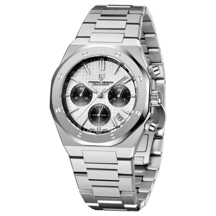 Reloj cronógrafo Pagani Design PD-1644 en acero con esfera blanca y bisel taquimétrico.