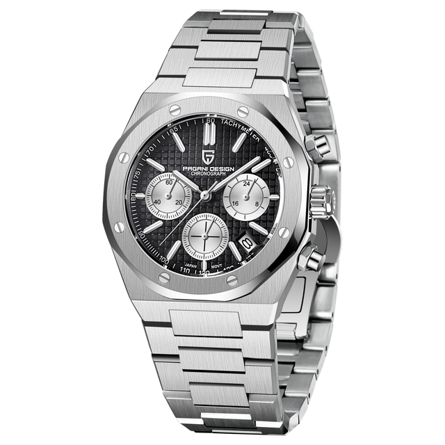 Reloj de acero Pagani Design PD-1707 Plateado cara negra con cronógrafo funcional y cristal de zafiro.